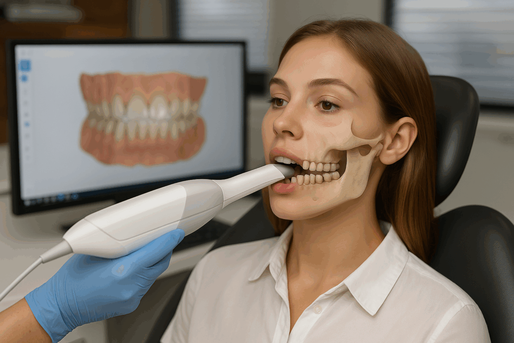 - Фотопротокол и внутриротовое сканирование — фиксируем положение зубов, высоту прикуса, симметрию лица.
